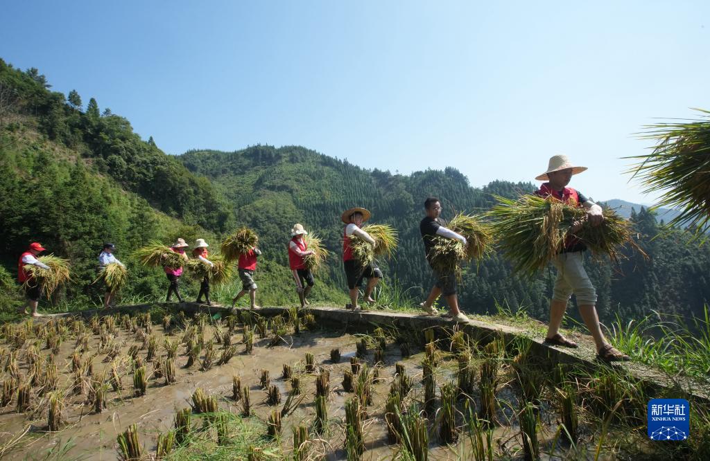 9月6日,在廣西柳州市融水苗族自治縣拱洞鄉培基村培堤苗寨,志愿者把剛收割的水稻搬到打谷機處脫粒。
