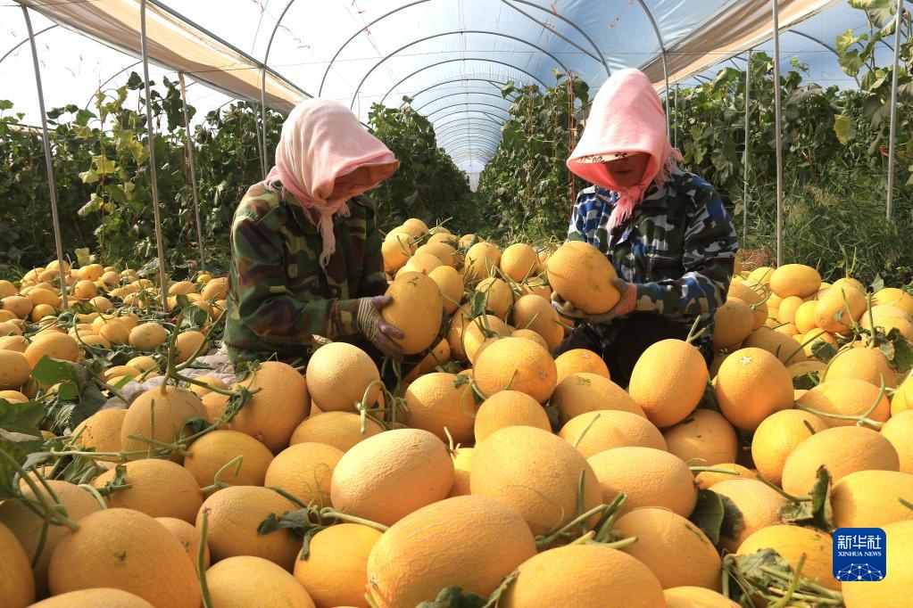 9月6日,在甘肅省敦煌市轉渠口鎮呂家莊村連棟鋼架大棚蜜瓜基地,農民將采摘的蜜瓜篩選分級。