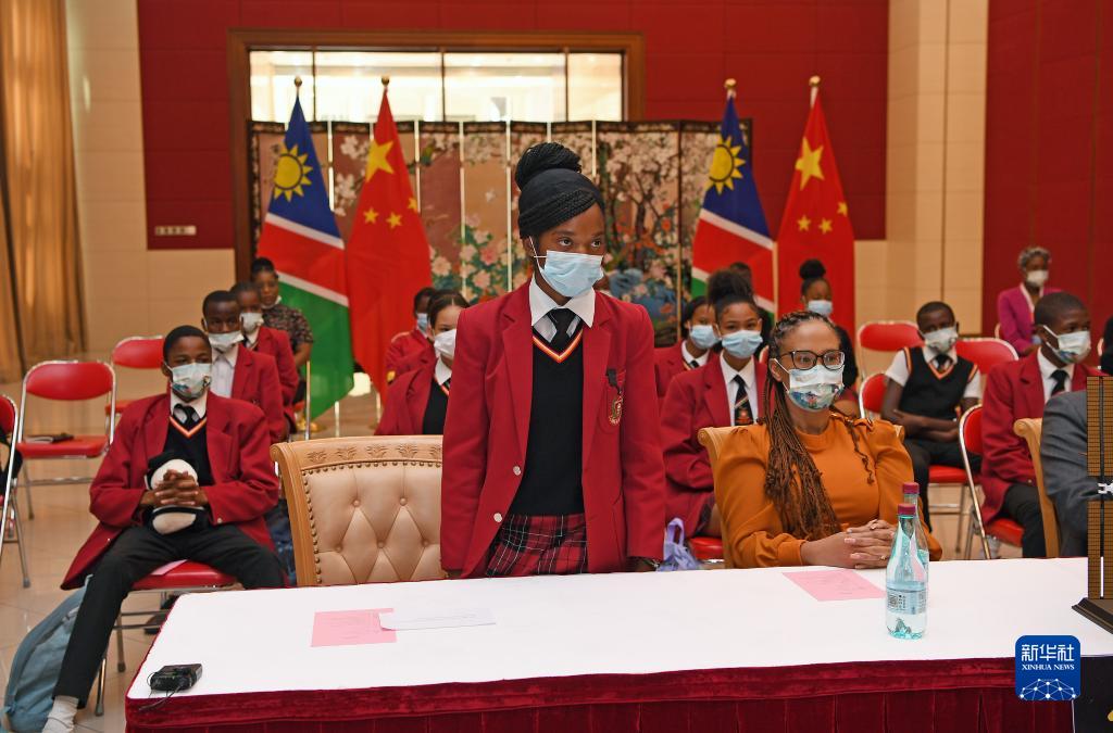 9月6日,在納米比亞首都溫得和克的“天宮對話(huà)”活動(dòng)納米比亞分會(huì )場(chǎng),一名學(xué)生向中國航天員提問(wèn)。