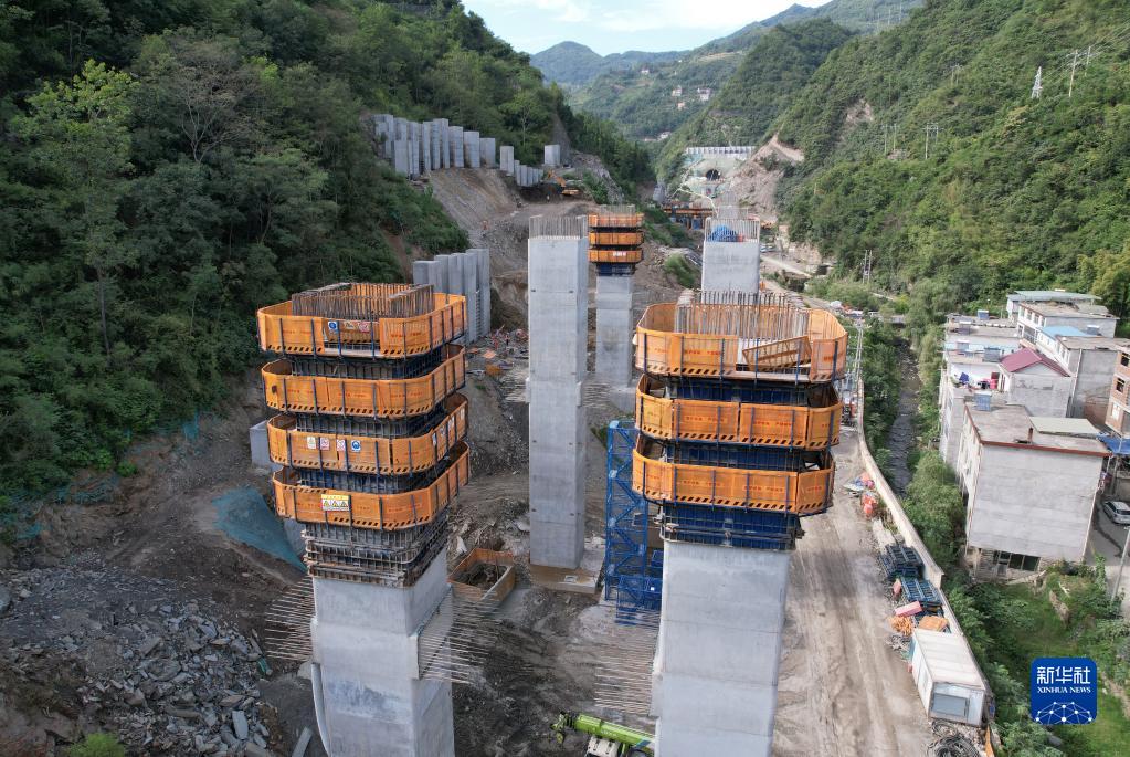 建設中的西康高鐵桐木車(chē)站特大橋(9月6日攝,無(wú)人機照片)。