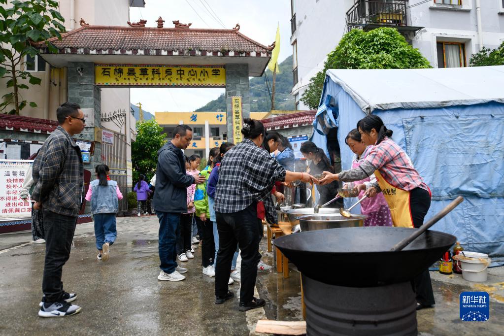 9月7日,在石棉縣草科鄉中心小學(xué),老師們組織學(xué)生有序排隊盛午飯。