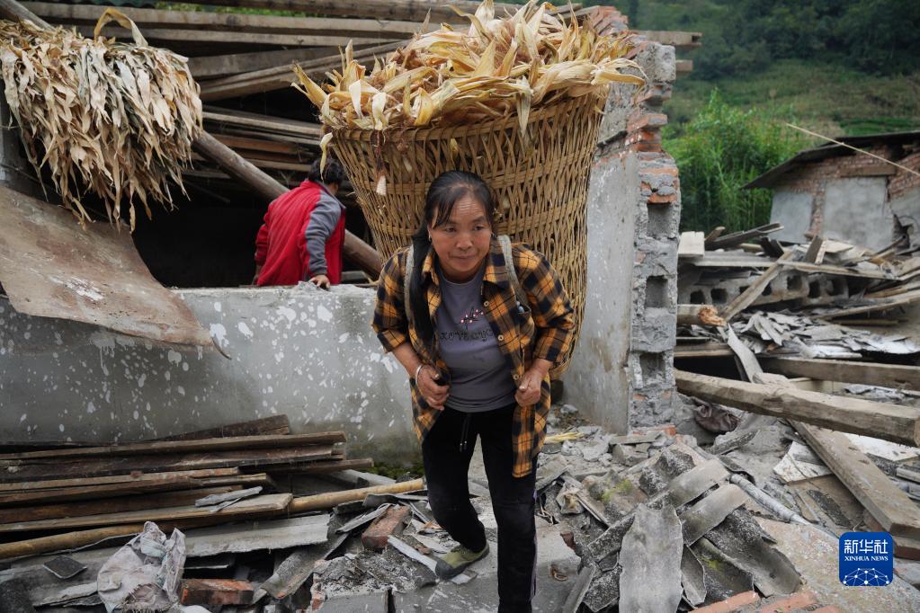 9月7日,在雅安市石棉縣王崗坪彝族藏族鄉幸福村二組,村民在倒塌的豬圈中搬運苞米葉。