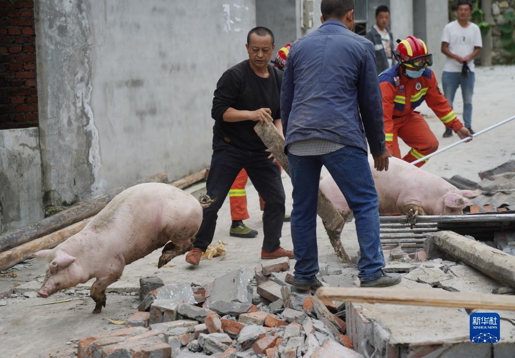 9月7日,在雅安市石棉縣王崗坪彝族藏族鄉幸福村二組,消防救援隊員協(xié)助村民從倒塌的豬圈中轉移豬。