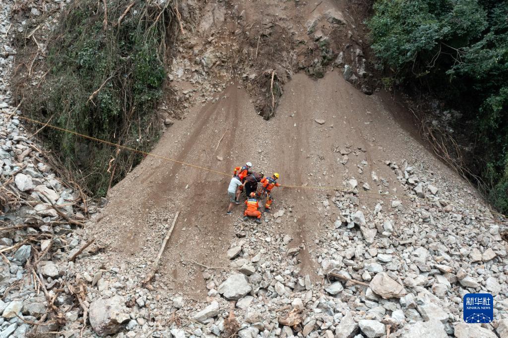 9月7日,在四川省甘孜州瀘定縣磨西鎮附近,四川省成都市消防救援支隊的救援人員轉移被困群眾。