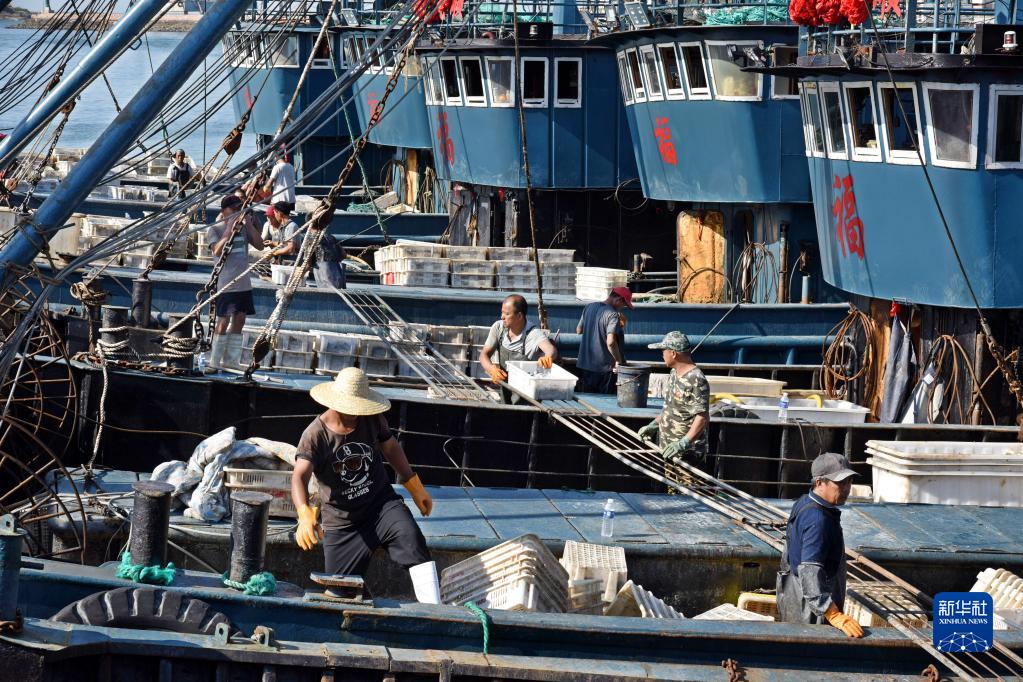 9月7日,在青島西海岸新區積米崖漁港碼頭,秋捕歸來(lái)的漁船紛紛靠港卸貨。 新華社記者 李紫恒 攝