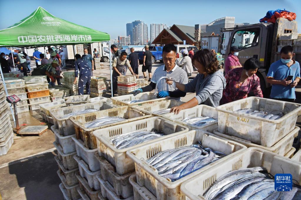9月7日,在青島西海岸新區積米崖漁港碼頭,魚(yú)販在進(jìn)貨選購。 新華社記者 李紫恒 攝