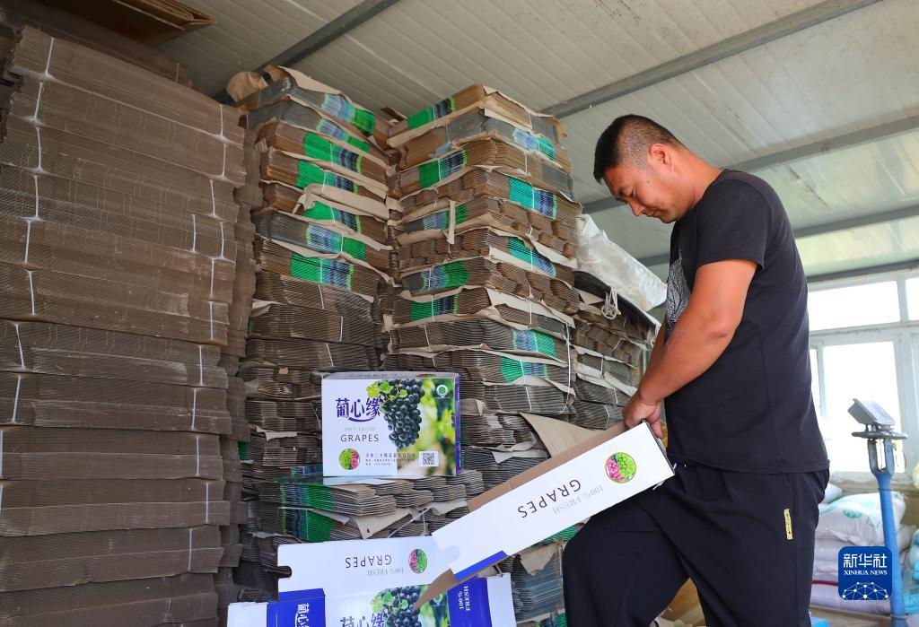 9月6日,在丁家房鎮大蛇山子村,果農在整理葡萄包裝盒。