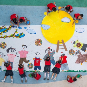 9月8日,長(cháng)橋中心幼兒園的孩子們在老師的帶領(lǐng)下用廢舊衣物等創(chuàng )作“月圓人團圓”環(huán)保創(chuàng )意畫(huà)(無(wú)人機照片)。