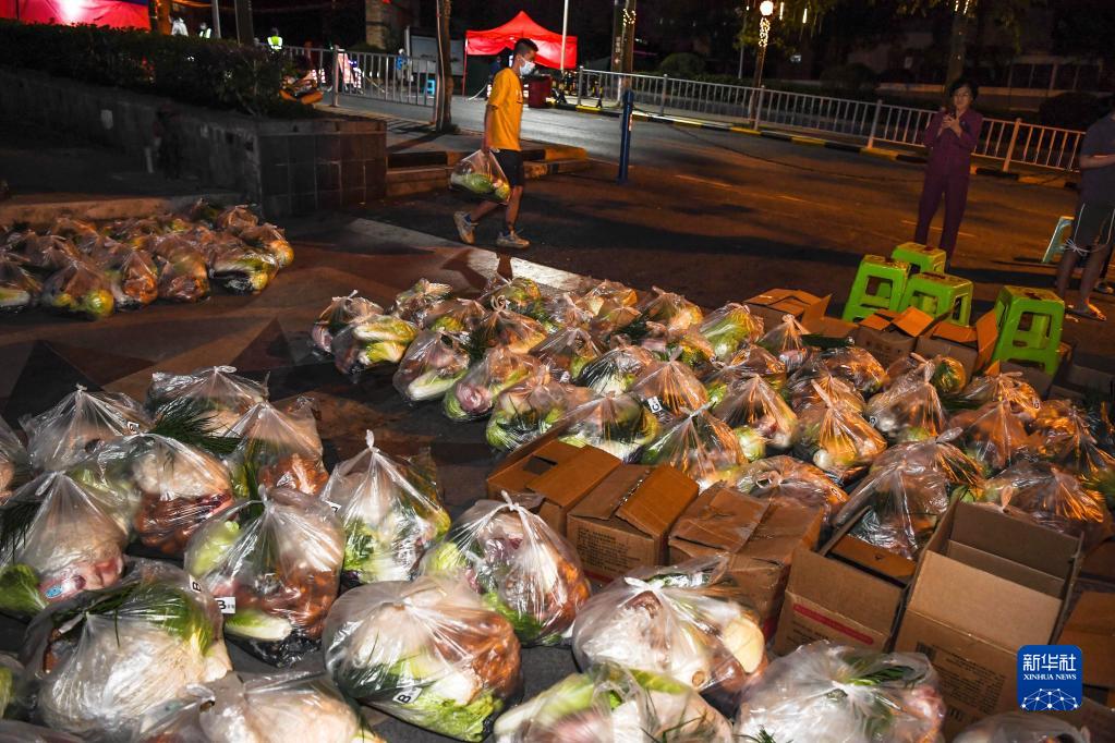 9月7日晚,在貴陽(yáng)市云巖區一居民小區,保供企業(yè)員工在給市民配送基本生活物品。