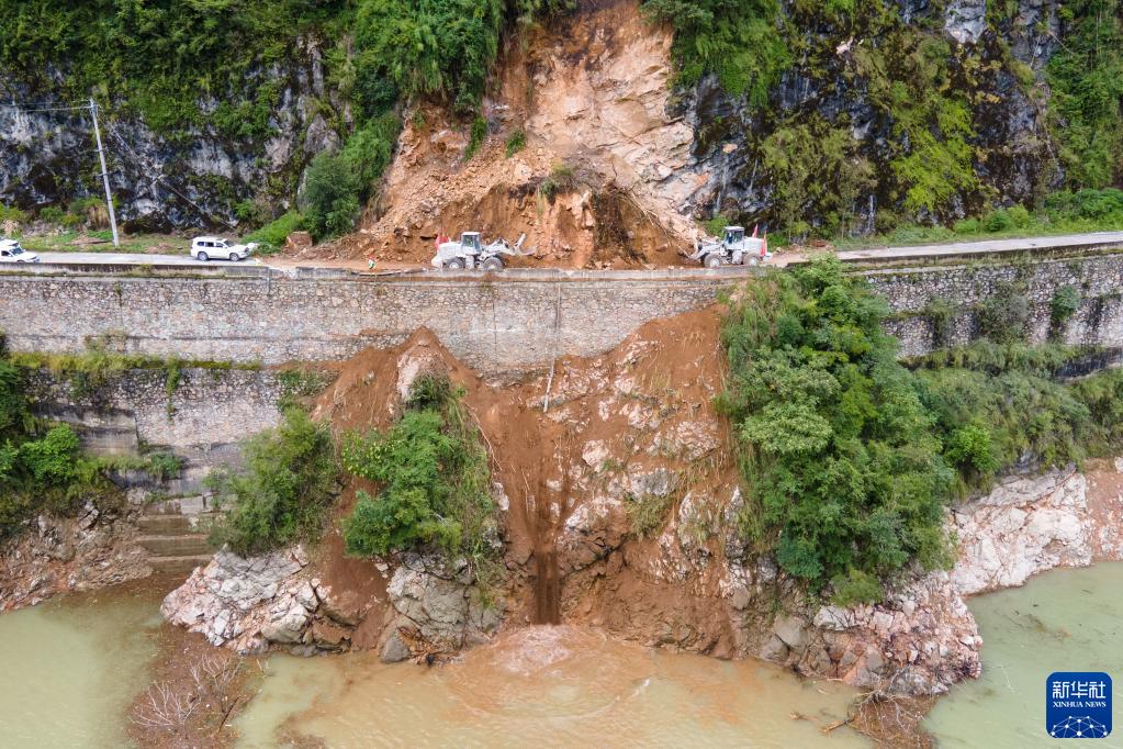 9月8日,四川路橋的工作人員搶修石棉縣與瀘定縣得妥鎮之間的道路(無(wú)人機照片)。