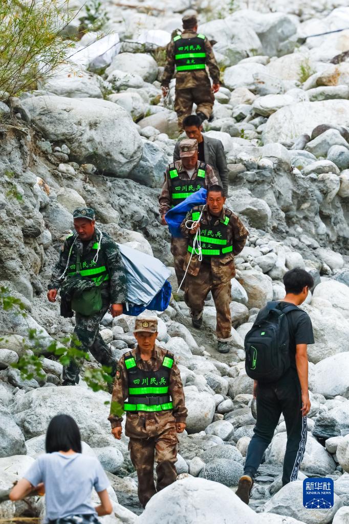 9月8日,在四川省甘孜州瀘定縣磨西鎮附近,救援人員沿著(zhù)磨西河畔的小路運送救災帳篷等物資。