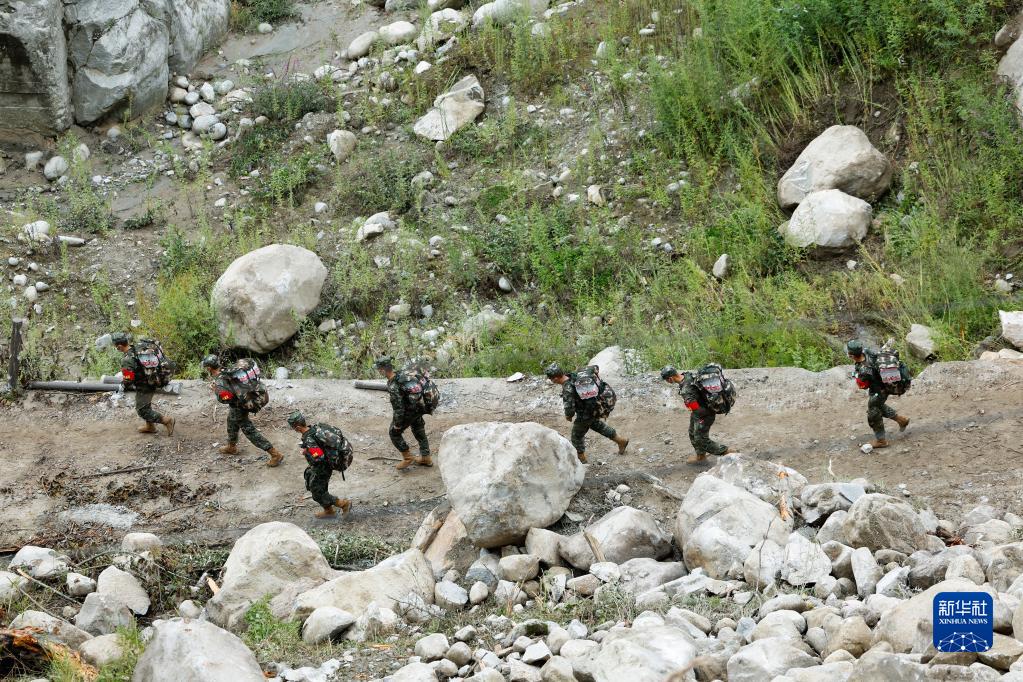 9月8日,在四川省甘孜州瀘定縣磨西鎮附近,救援人員沿著(zhù)在山體上臨時(shí)開(kāi)辟的小路運送生活物資。