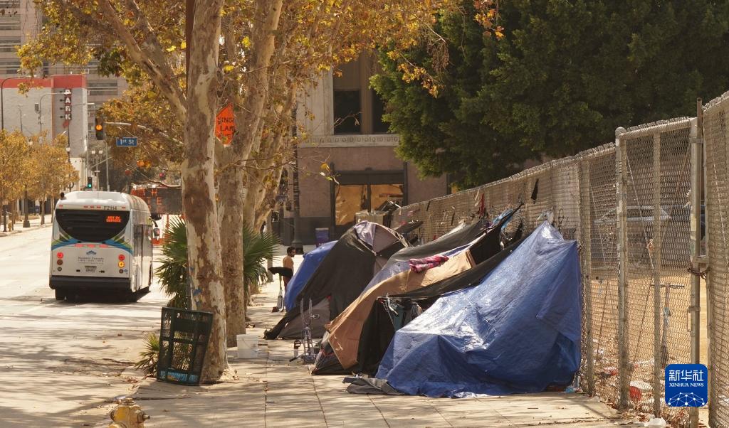 9月8日,在美國加利福尼亞州洛杉磯市區,街頭可見(jiàn)多個(gè)無(wú)家可歸者的帳篷。