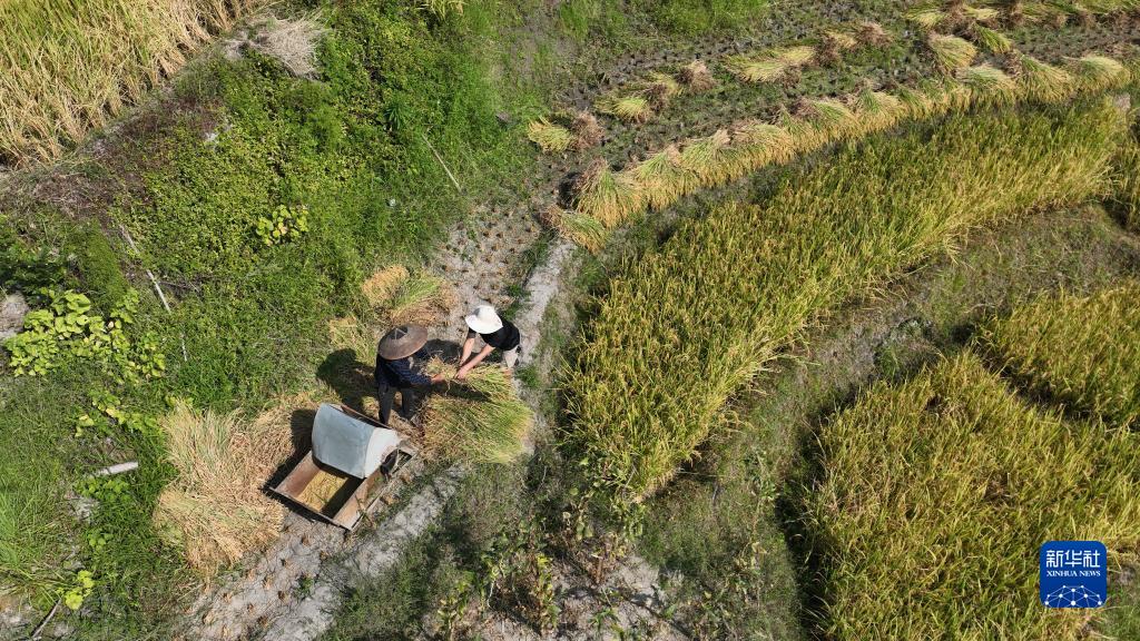 在中國農民豐收節即將到來(lái)之際,“世界灌溉工程遺產(chǎn)”“全球重要農業(yè)文化遺產(chǎn)”湖南省婁底市新化縣水車(chē)鎮紫鵲界梯田種植的水稻陸續進(jìn)入成熟期,田野一片金黃,農民利用晴好天氣搶收搶割。