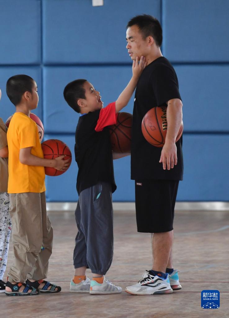 在福州市星語(yǔ)學(xué)?;@球館,一名學(xué)生與老師聶親水互動(dòng)(9月7日攝)。