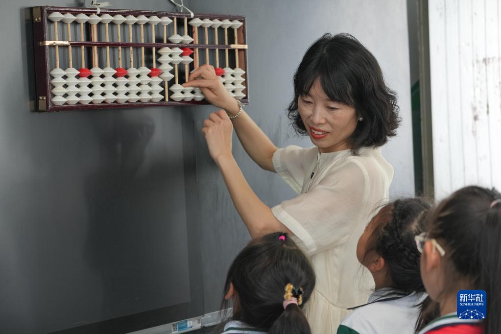9月6日,在安徽省黃山市屯溪大位小學(xué),汪素秋在課堂上教授學(xué)生們珠算知識。
