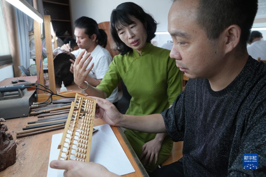 9月7日,在安徽省黃山市徽州區一家雕刻工作室,汪素秋與雕刻技師探討改進(jìn)型算盤(pán)的制作工藝。