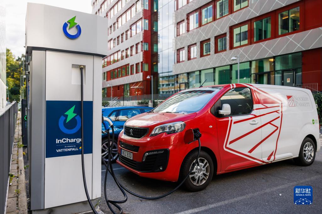 這是9月8日在瑞典斯德哥爾摩拍攝的一處電車(chē)充電設施。