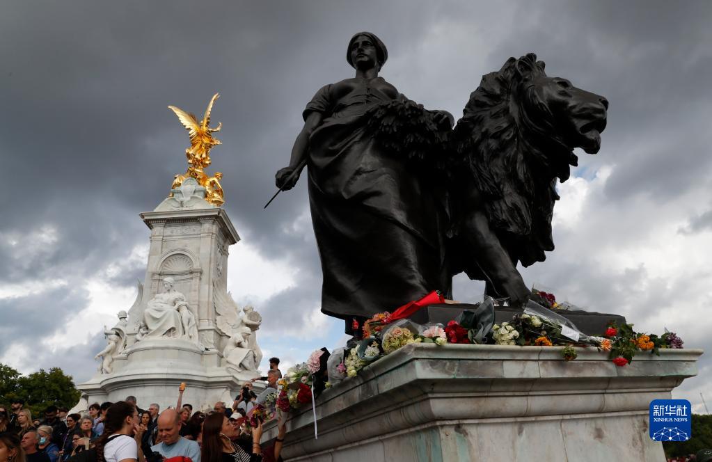 9月9日,在英國倫敦,人們將悼念英國女王伊麗莎白二世的鮮花和卡片擺放在維多利亞女王紀念碑前的雕塑旁。