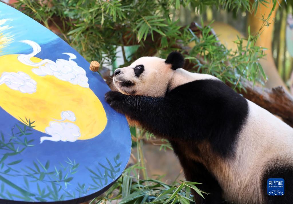 9月9日,在廣州長(cháng)隆野生動(dòng)物世界,大熊貓“帥帥”準備品嘗特制“月餅”。