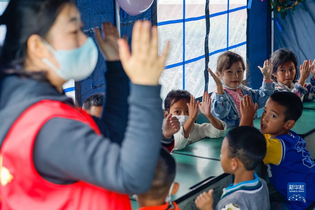 9月10日,在瀘定二中臨時(shí)安置點(diǎn)的“帳篷課堂”里,志愿者在教孩子手語(yǔ)游戲。