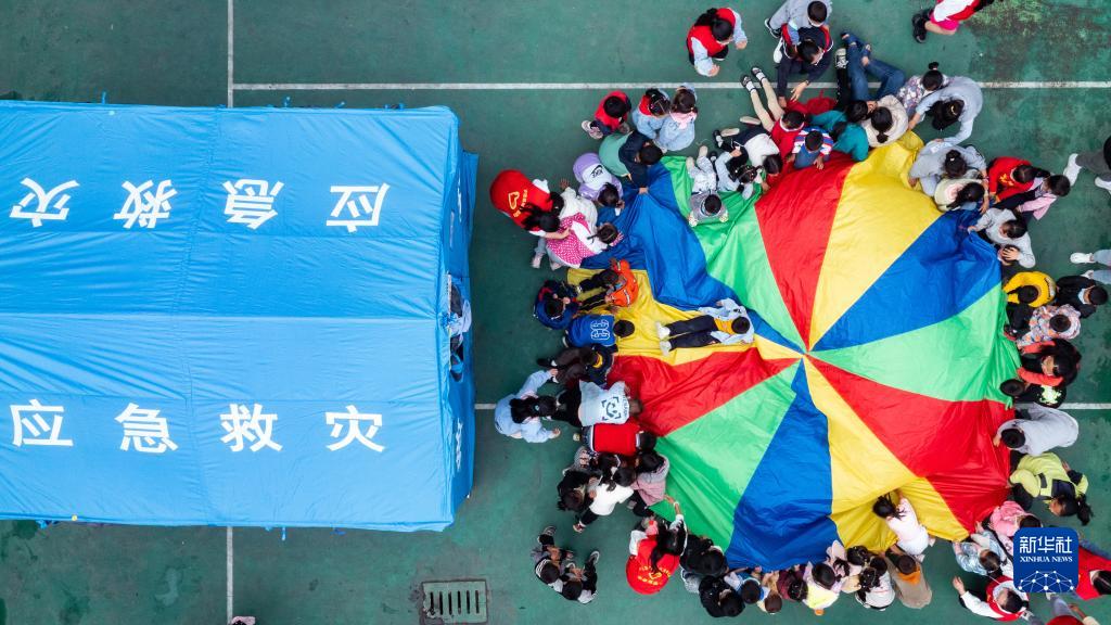 9月10日,在瀘定二中臨時(shí)安置點(diǎn),孩子和志愿者一起玩彩虹傘游戲(無(wú)人機照片)。