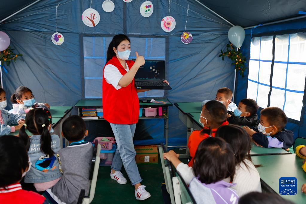 9月10日,在瀘定二中臨時(shí)安置點(diǎn)的“帳篷課堂”里,老師志愿者辜曉鑫教孩子們關(guān)于月亮變化的知識。