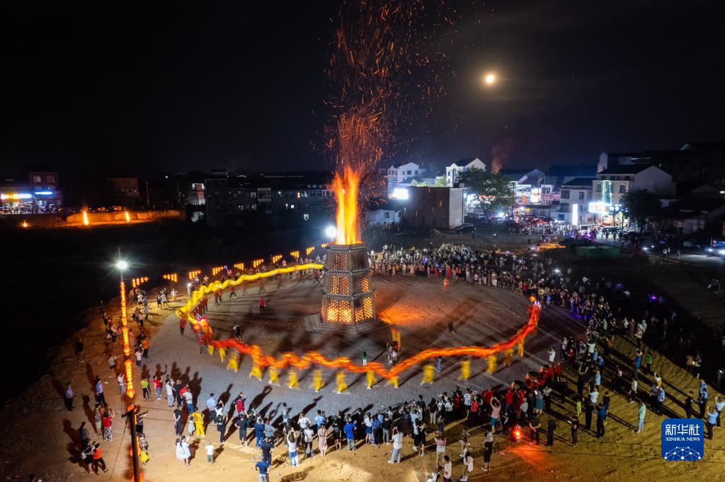 9月10日,在湖南省汨羅市新市鎮,居民舉行“中秋耍寶塔”民俗活動(dòng)(無(wú)人機照片)。