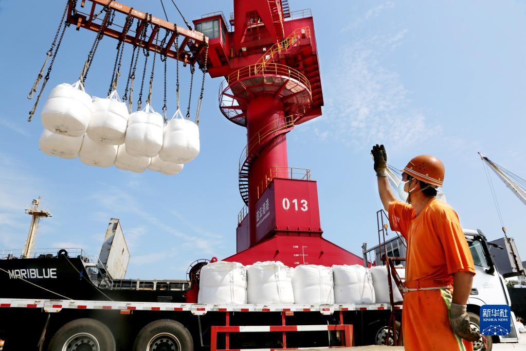 9月10日,碼頭工人在江蘇連云港港東方公司碼頭的泊位上作業(yè)。