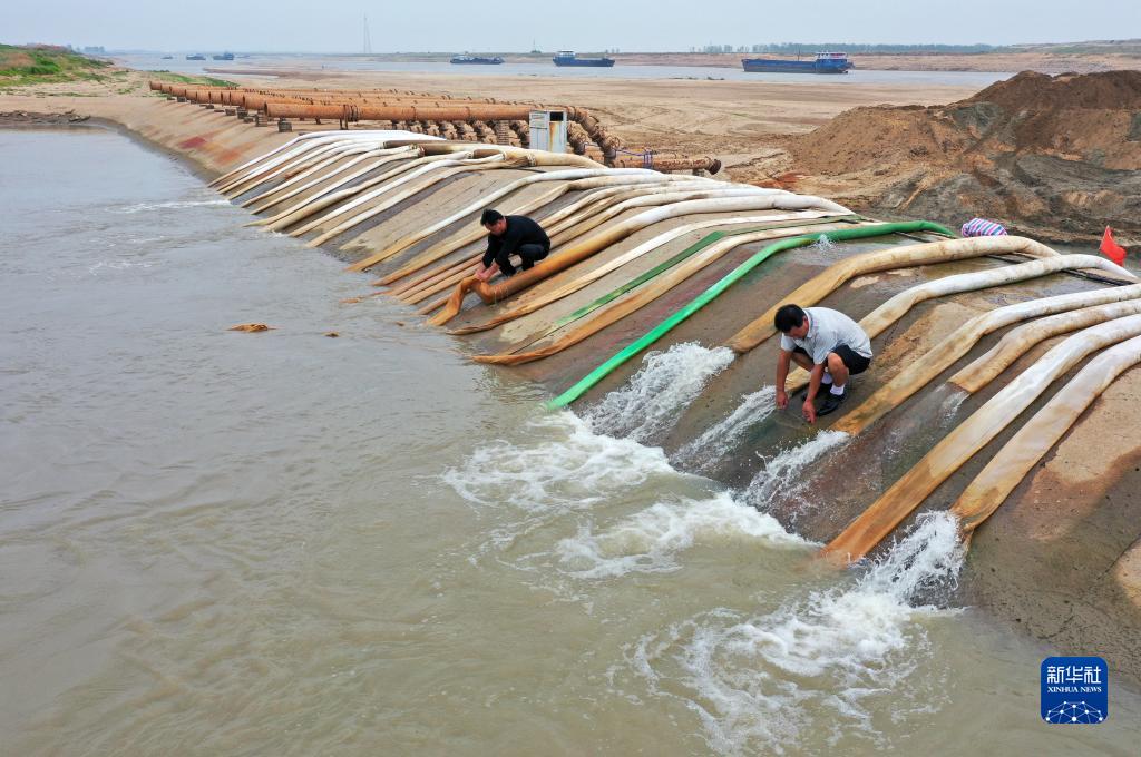 9月8日,在鄱陽(yáng)湖畔的南昌市新建區鐵河鄉一電排站,工作人員從外河引水渠抽水灌溉農田(無(wú)人機照片)。