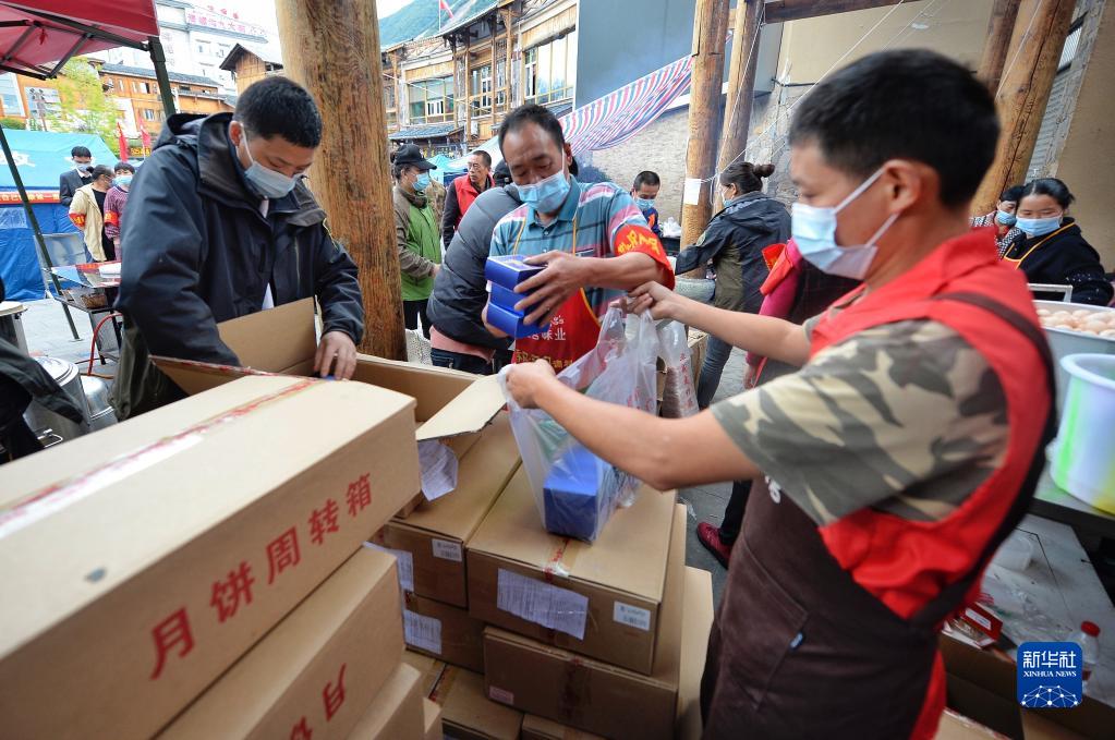 9月10日,在四川省瀘定縣磨西鎮安置點(diǎn),志愿者為受災群眾和救援人員分發(fā)月餅,共度中秋。