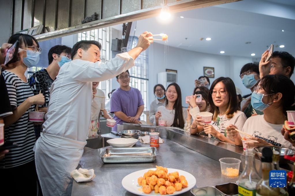 9月9日,鄒志平在《中國名菜鑒賞》課堂上展示拔絲西瓜球。