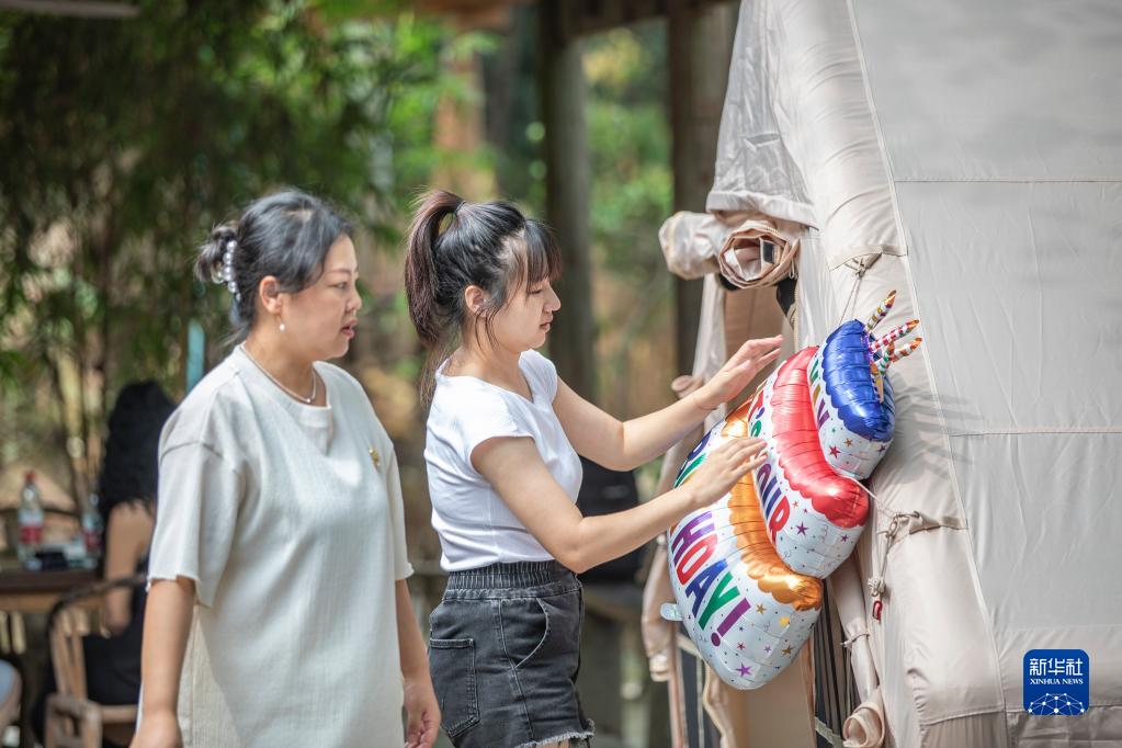 9月10日,游客在重慶市巴南區二圣鎮集體村的一家民宿內搭帳篷。新華社記者 黃偉 攝