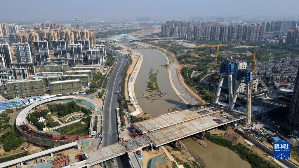 建設施工中的中鐵四局引江濟淮工程江淮溝通段金寨南路橋項目現場(chǎng)(9月11日攝,無(wú)人機照片)。新華社記者 劉軍喜 攝