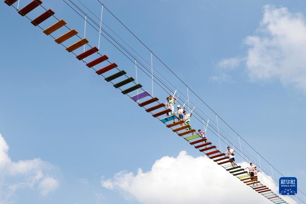 9月11日,在江蘇省宿遷市泗洪縣界集鎮夢(mèng)幻樂(lè )園,游客在七彩玻璃橋上行走。