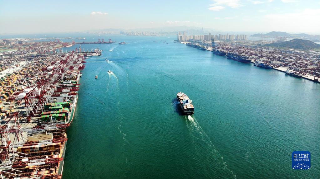 一艘滿(mǎn)載集裝箱的貨輪駛離山東港口青島港(9月10日攝,無(wú)人機照片)。