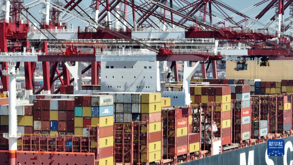 貨輪在山東港口青島港前灣三期集裝箱碼頭裝卸(9月10日攝,無(wú)人機照片)。