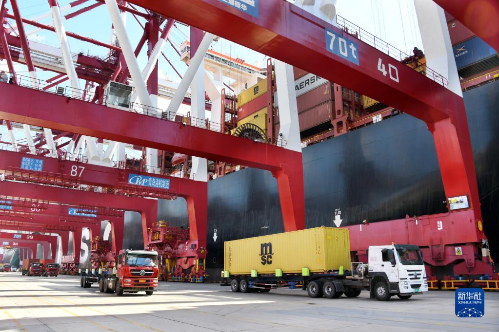 貨車(chē)在山東港口青島港前灣三期集裝箱碼頭運送集裝箱(9月10日攝)。