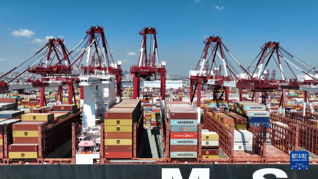 貨輪在山東港口青島港前灣三期集裝箱碼頭裝卸(9月10日攝,無(wú)人機照片)。
