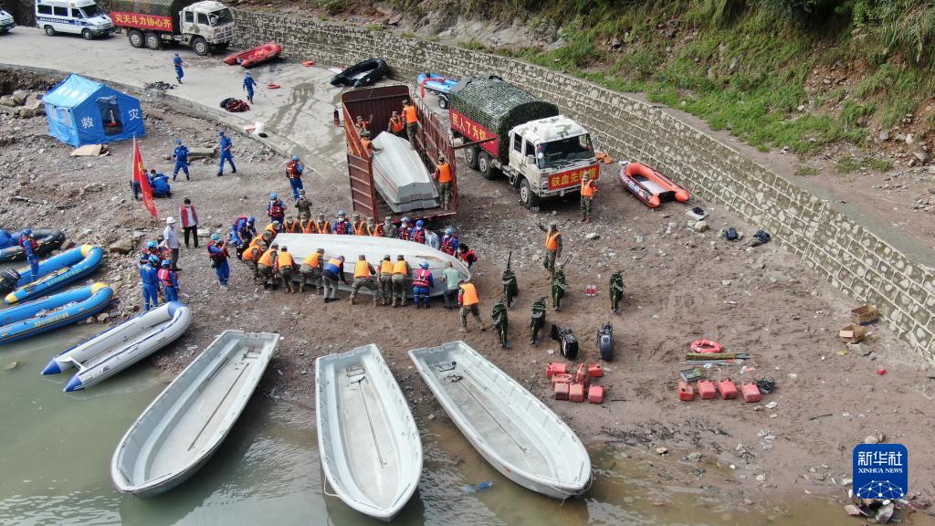9月10日,陸軍第77集團軍某工兵旅官兵在大渡河流域王崗坪鄉河段卸載沖鋒舟(無(wú)人機照片)。