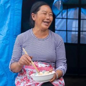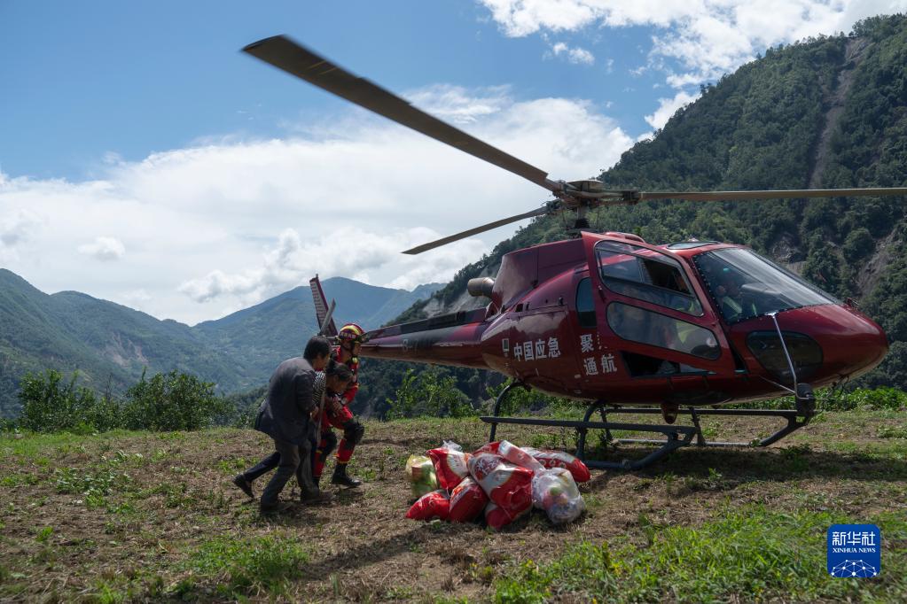 9月10日,在四川省石棉縣幸福村,成都市消防救援支隊特勤大隊二站站長(cháng)助理郭習青與村民一起轉運受傷村民到應急管理部南方航空護林總站的救援直升機。