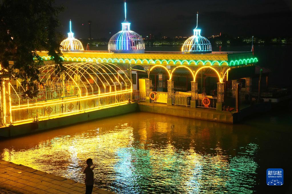 中秋假日,冰城哈爾濱市的松花江畔夜色迷人,吸引市民前來(lái)賞景游玩。