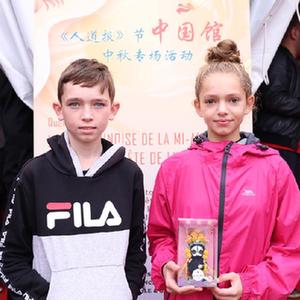 9月10日,在法國巴黎近郊舉辦的法國共產(chǎn)黨《人道報》節上,兩名法國小朋友在中國館外與義賣(mài)的戲曲人物泥塑合影。