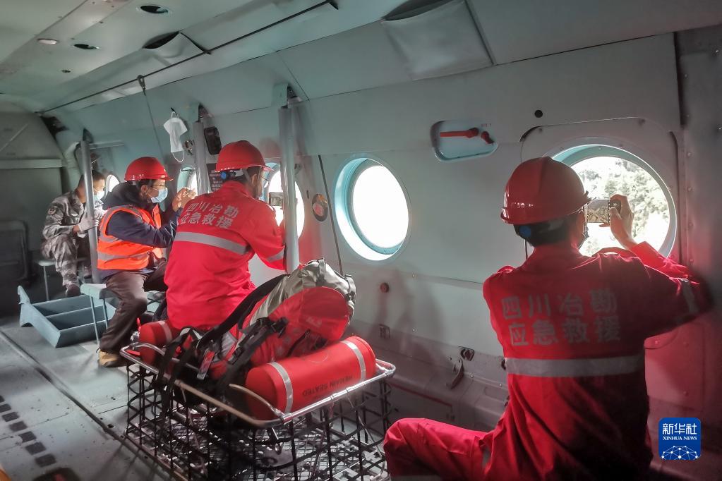 9月7日,四川省冶勘設計集團有限公司的調查隊員在前往海螺溝景區的直升機上拍攝。