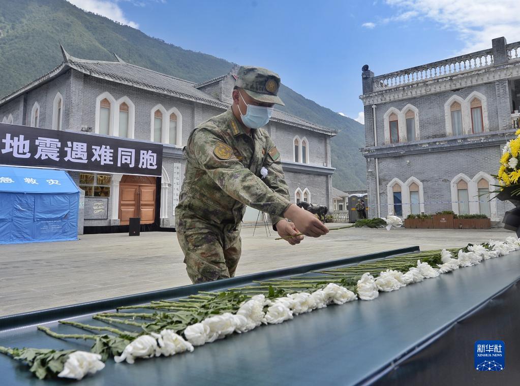 9月12日,在瀘定縣磨西鎮,參加悼念活動(dòng)的人員向遇難同胞獻花。