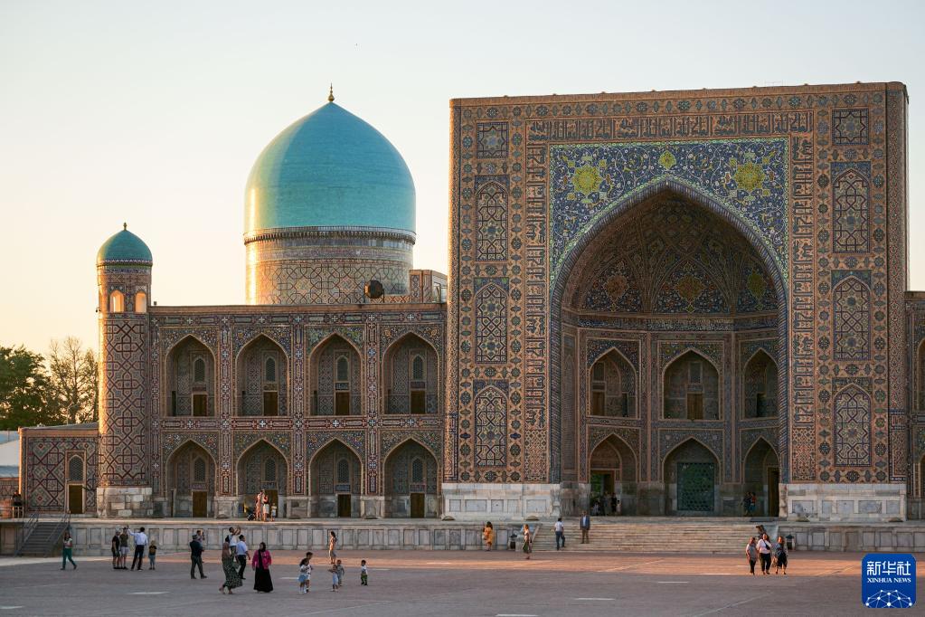 9月3日,人們在烏茲別克斯坦撒馬爾罕市列吉斯坦廣場(chǎng)游覽。