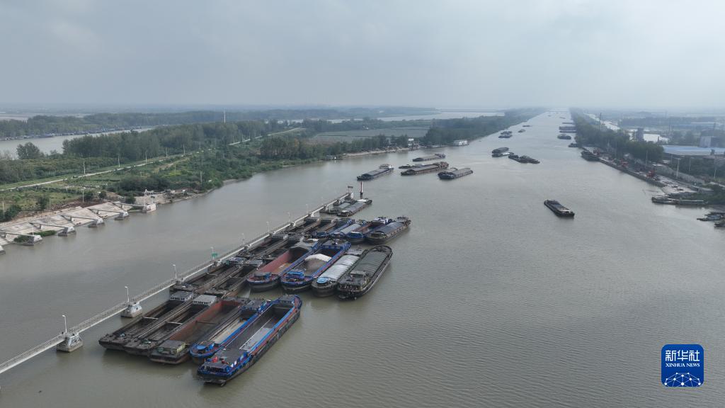9月13日,船只停泊在江蘇省淮安市蘇北灌溉總渠內避風(fēng)(無(wú)人機照片)。