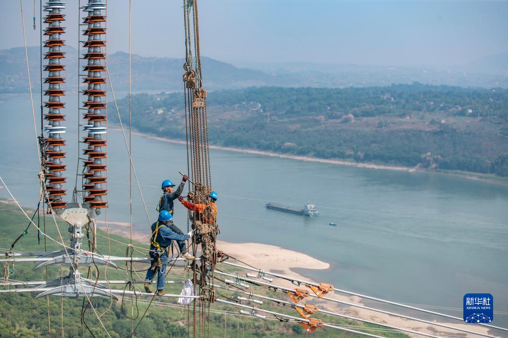 9月13日,工人在白鶴灘-浙江±800千伏特高壓直流輸電線(xiàn)路工程(重慶段)江津長(cháng)江大跨越施工現場(chǎng)作業(yè)。