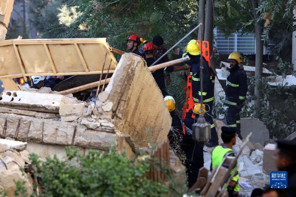 9月13日,救援人員在約旦首都安曼的居民樓倒塌事故現場(chǎng)工作。
