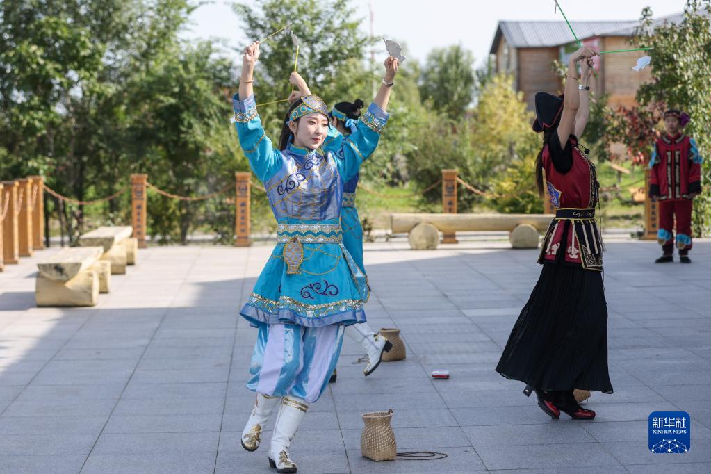 9月4日,在黑龍江撫遠市烏蘇鎮抓吉赫哲族村赫哲民俗展示館前,尚美含(左一)和赫哲族青年一起表演民族舞蹈。
